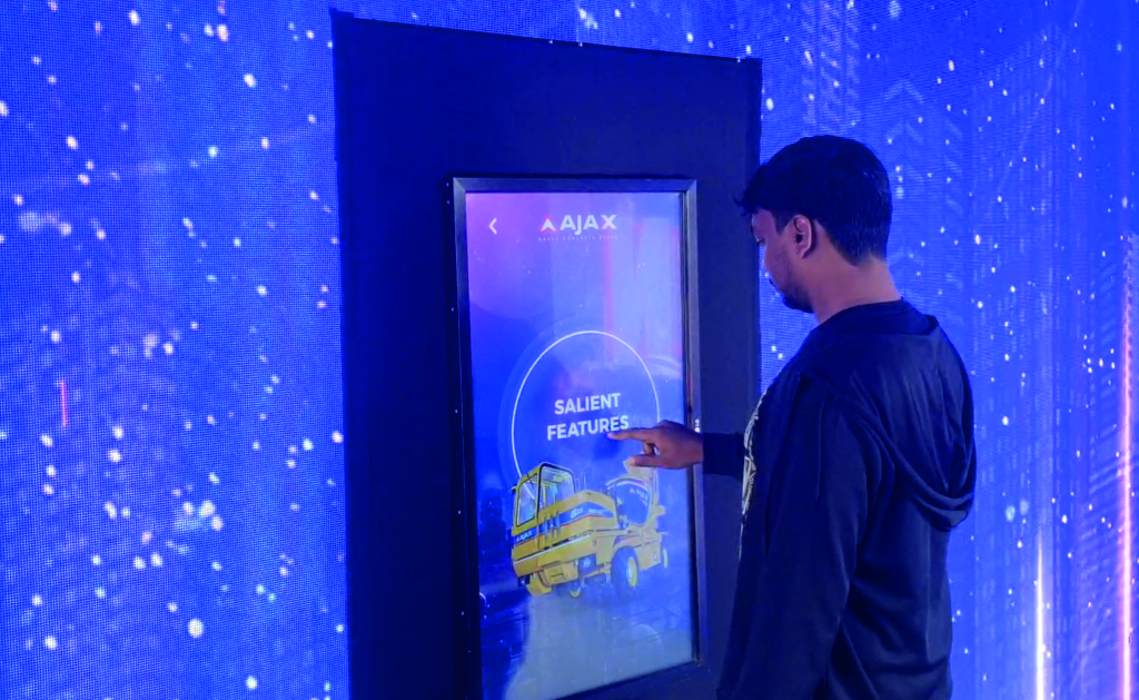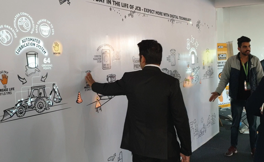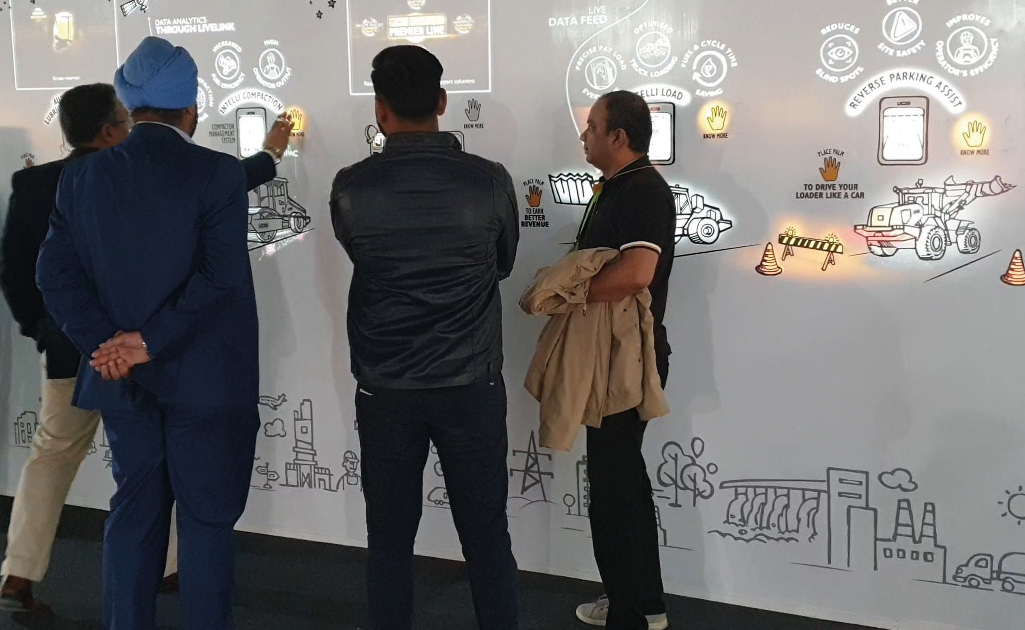 Interactive Touch Wall is a Interactive installation used to showcase products or services in a interesting way . Its a clutter breaking way to standout in a Trade show or a business conference.Touch wall uses a creatively designed wall canvas , touch sensors and projection system to tell a product story We have used touch wall extensively for construction equipment trade shows such as Excon and Bauma .We designed the touch wall exclusively for JCB at EXCON to showcase six features , Automated lubrication system,Intelli Compaction,JCB Premeir Line, Intelli Load, Reverse Parking Assist and Easy Shift Transmission of their excavator and backhoe line.