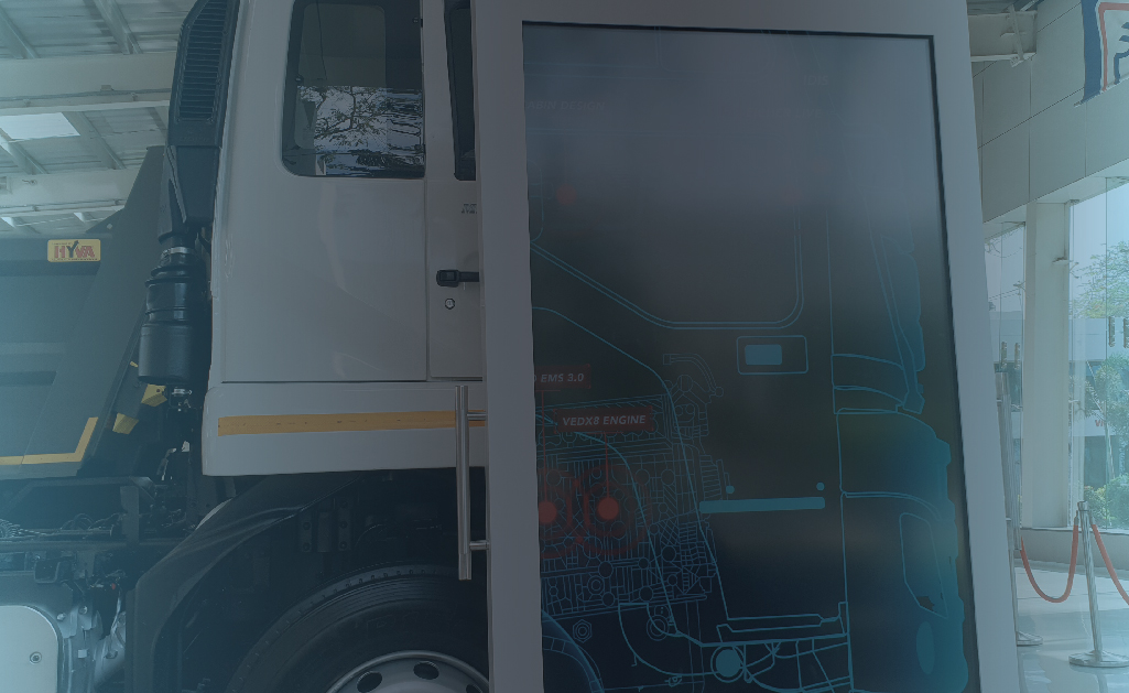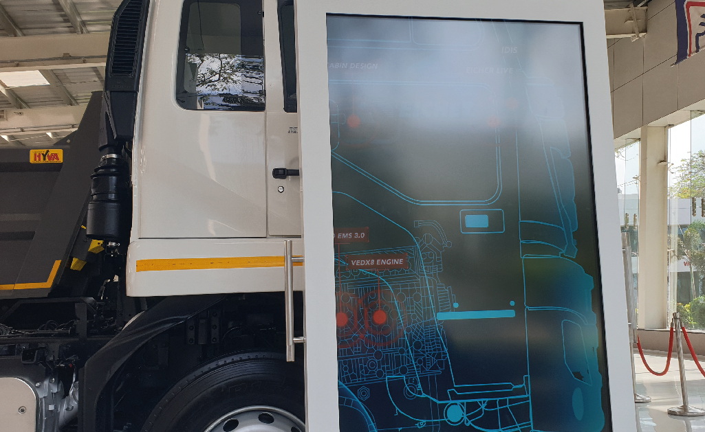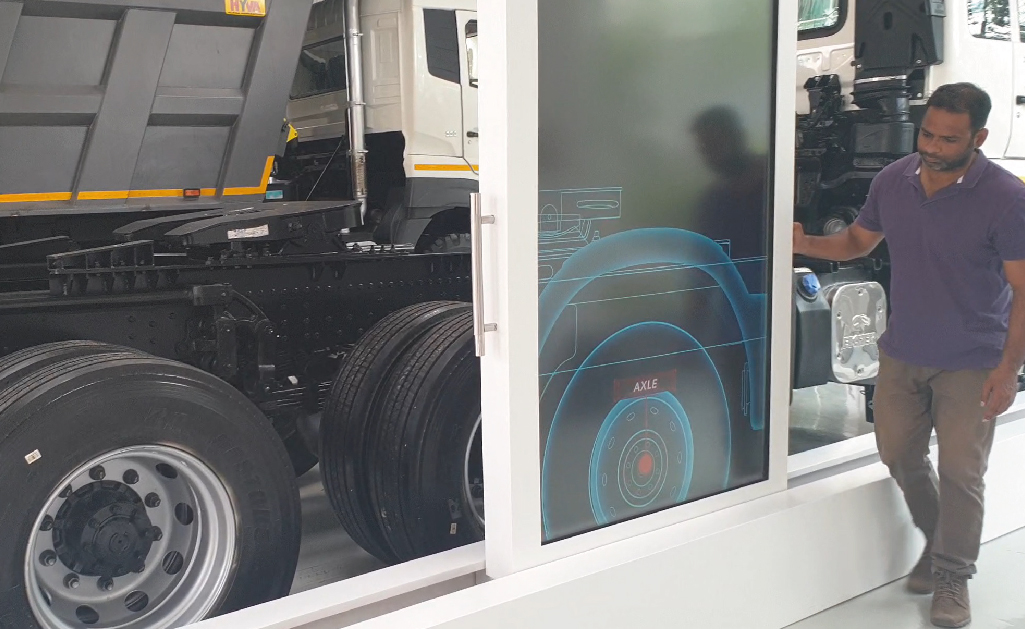 Sliding screen uses the X-Ray vision technology which shows the entire truck from inside and outside and thereby helps visitors visualize the engine, axle , transmission and suspension in detail
