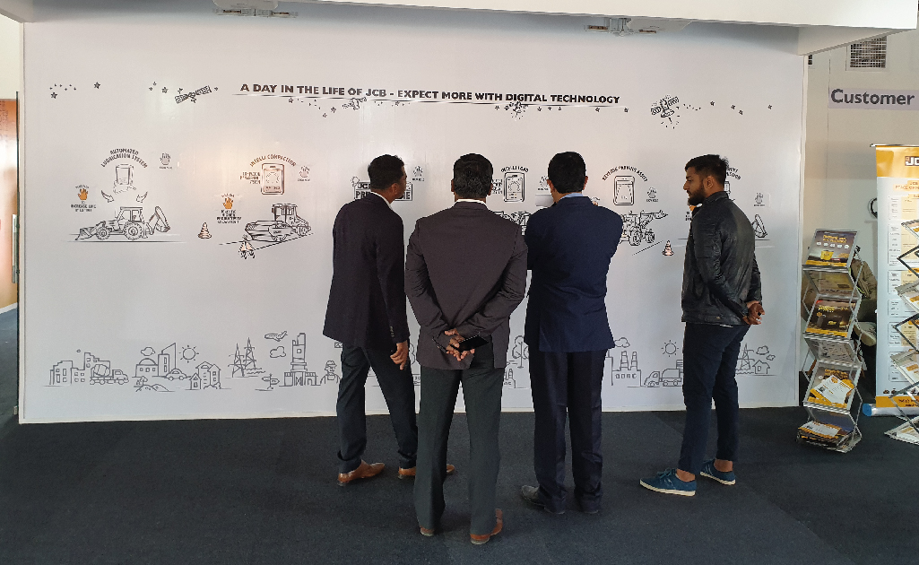 Interactive Touch Wall is a Interactive installation used to showcase products or services in a interesting way . Its a clutter breaking way to standout in a Trade show or a business conference.Touch wall uses a creatively designed wall canvas , touch sensors and projection system to tell a product story We have used touch wall extensively for construction equipment trade shows such as Excon and Bauma .We designed the touch wall exclusively for JCB at EXCON to showcase six features , Automated lubrication system,Intelli Compaction,JCB Premeir Line, Intelli Load, Reverse Parking Assist and Easy Shift Transmission of their excavator and backhoe line.